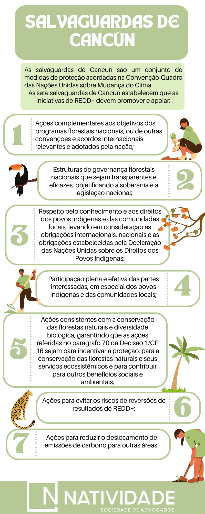 As salvaguardas de REDD+ também são conhecidas como salvaguardas de Cancun e objetivam garantir a participação social, a preservação de ecossistemas naturais, a permanência dos resultados de REDD+ alcançados e o risco de deslocamento da pressão por desmatamento e degradação florestal para outras áreas.